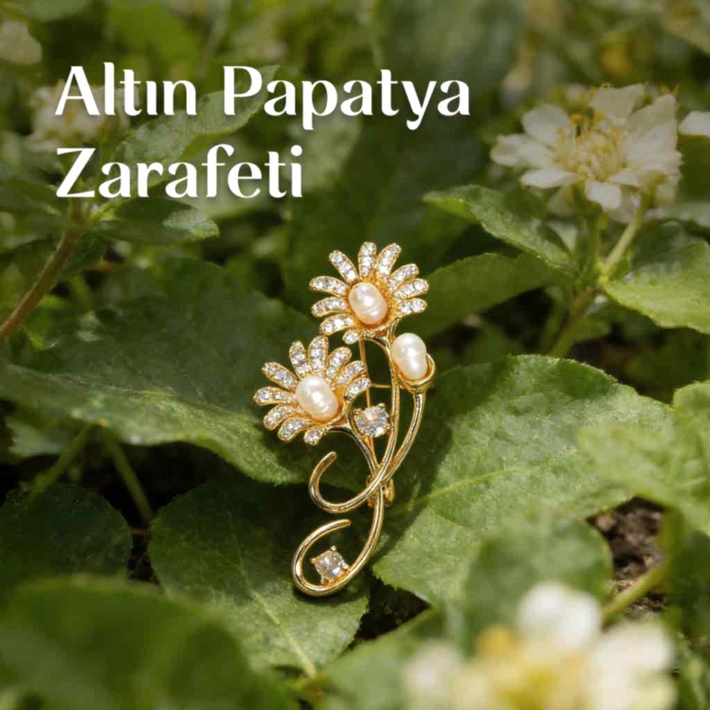 İncili Altın Renk Papatya Şeklinde Broş, papatya figürüyle saflığı ve sadeliği simgelerken, altın rengi ve incinin zarif ışıltısı bu broşu, adeta sessiz fakat etkileyici bir gösteriye dönüştürür.